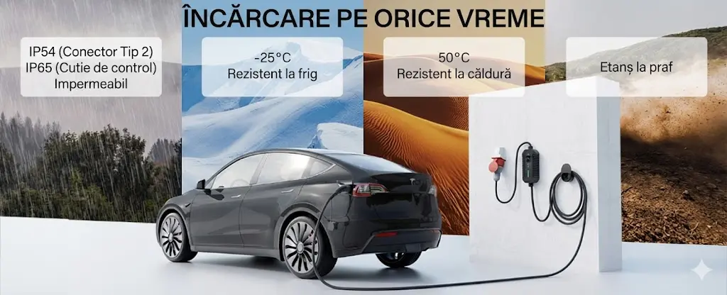 Răspuns: Absolut. Unitatea de control are protectie IP66 (rezistenta la jet de apa), iar mufa Tip 2 are IP55. Functioneaza in conditii de temperatura de la -25C pana la +55C.